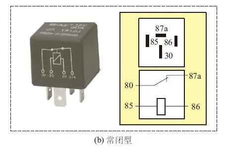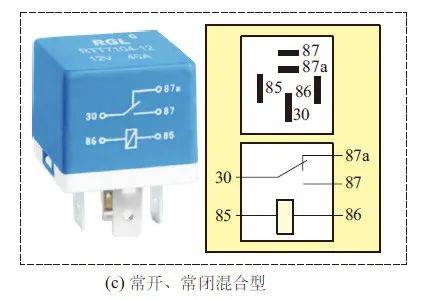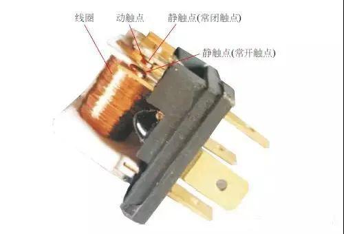 電磁式繼電器一般由鐵芯、線圈、銜鐵、回位彈簧、觸點等組成。下圖所示為常開、常閉混合型繼電器內(nèi)部結(jié)構圖。